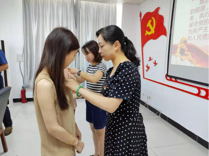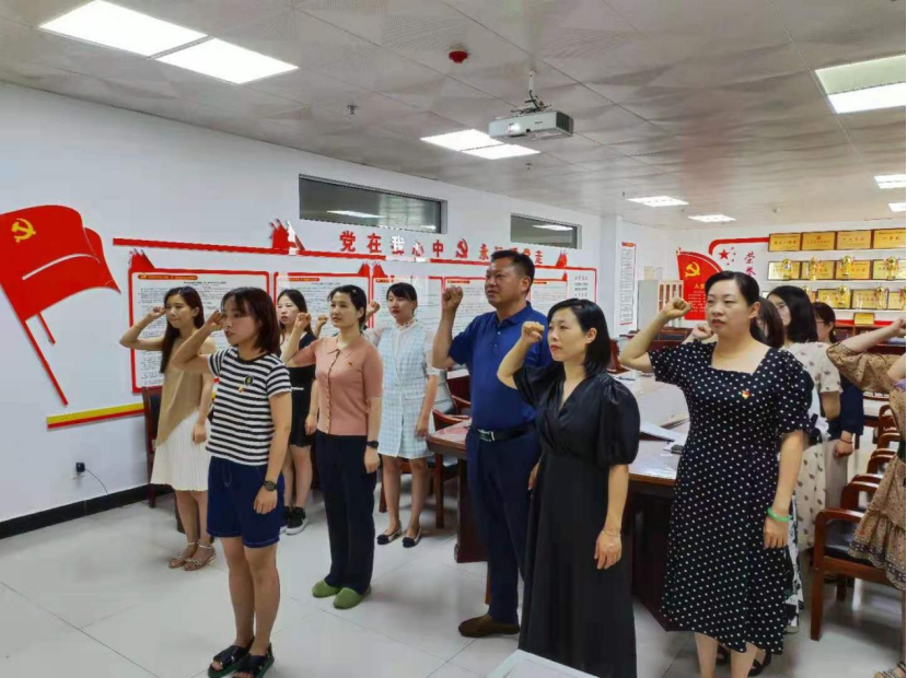 在教工党支部宣传委员李桂林同志的带领下,张颖颖、刘铮两位同志及金年会jinnianhuicom全体教工支部党员面对党旗,庄严宣誓。