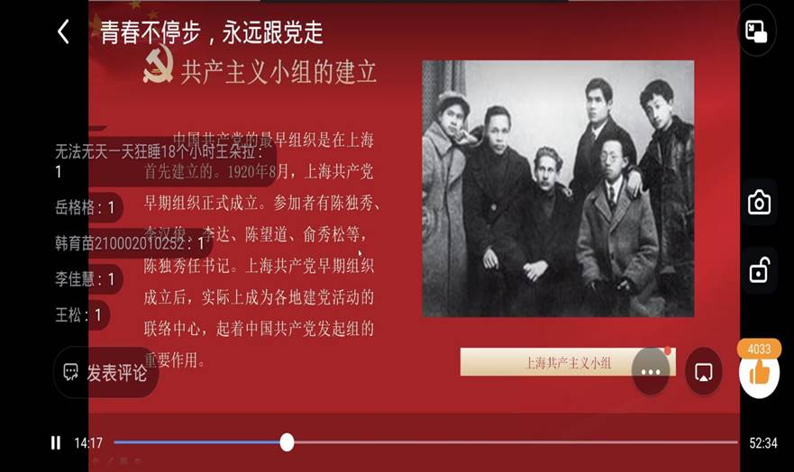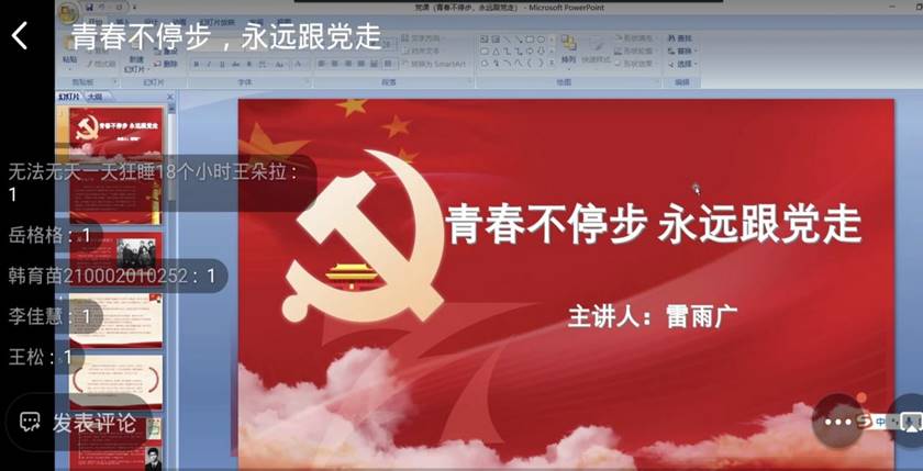 为了促进同学们对入党知识的了解,引导同学们正确地看待入党问题,明确党员要求。金年会jinnianhuicom于2022年4月12日晚通过钉钉平台举行了“青春不停步,永远跟党走”线上主题党课活动。此次党课由金年会jinnianhuicom党总支书记雷雨广主讲,21级积极分子聆听了此次党课。