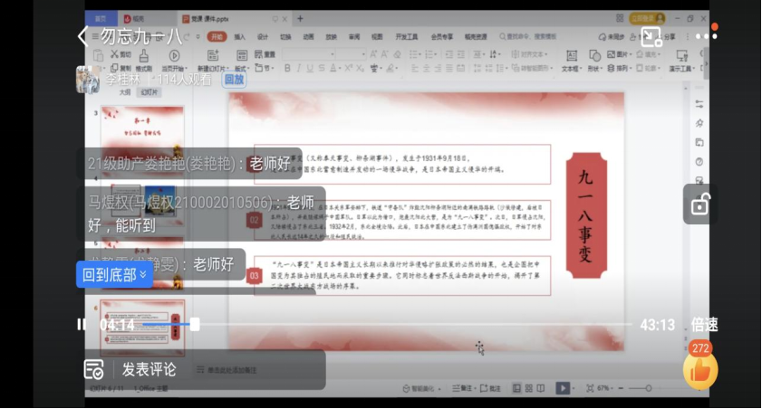 牢记历史,就是开创未来。为教育广大青年学生不忘国耻,珍爱和平,增强爱国主义意识,金年会jinnianhuicom于9月28日晚,通过线上钉钉开展了“勿忘九一八,吾辈当自强”主题党课活动。本次党课由金年会jinnianhuicom李桂林老师主讲,金年会jinnianhuicom部分党员教师及21级积极分子聆听了此次党课。