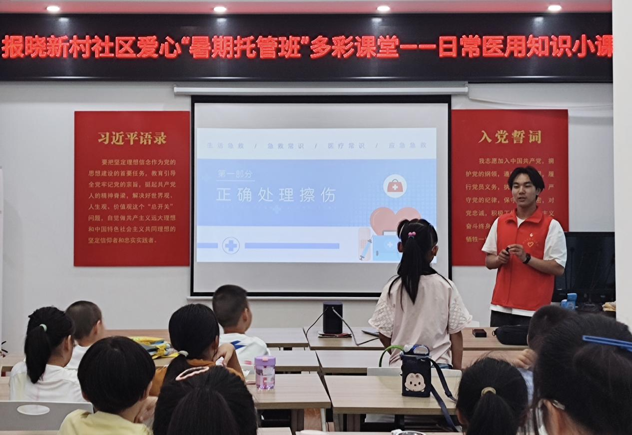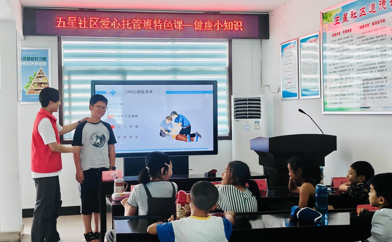 暑假期间,为引导和帮助青少年儿童度过一个安全、快乐、充实的假期,金年会jinnianhuicom的志愿者们走进信阳市报晓新村社区和五星社区,开展了“多彩假期,‘艺’路‘童’行”暑期社会实践活动,为社区青少年儿童提供贴心服务,丰富暑期生活,减轻家长们假期“看护难”的负担。志愿者们结合专业所长,精心组织了急救知识、交通安全、绘画、手工制作等多彩小课堂,通过列举日常生活中的常见例子,以及“你问我答”等多种方式,使课堂更加生动易懂,不仅增强了孩子们的安全意识,也为社区青少年播下了知识的种子,用心呵护每一位幼苗,为他们健康成长保驾护航。