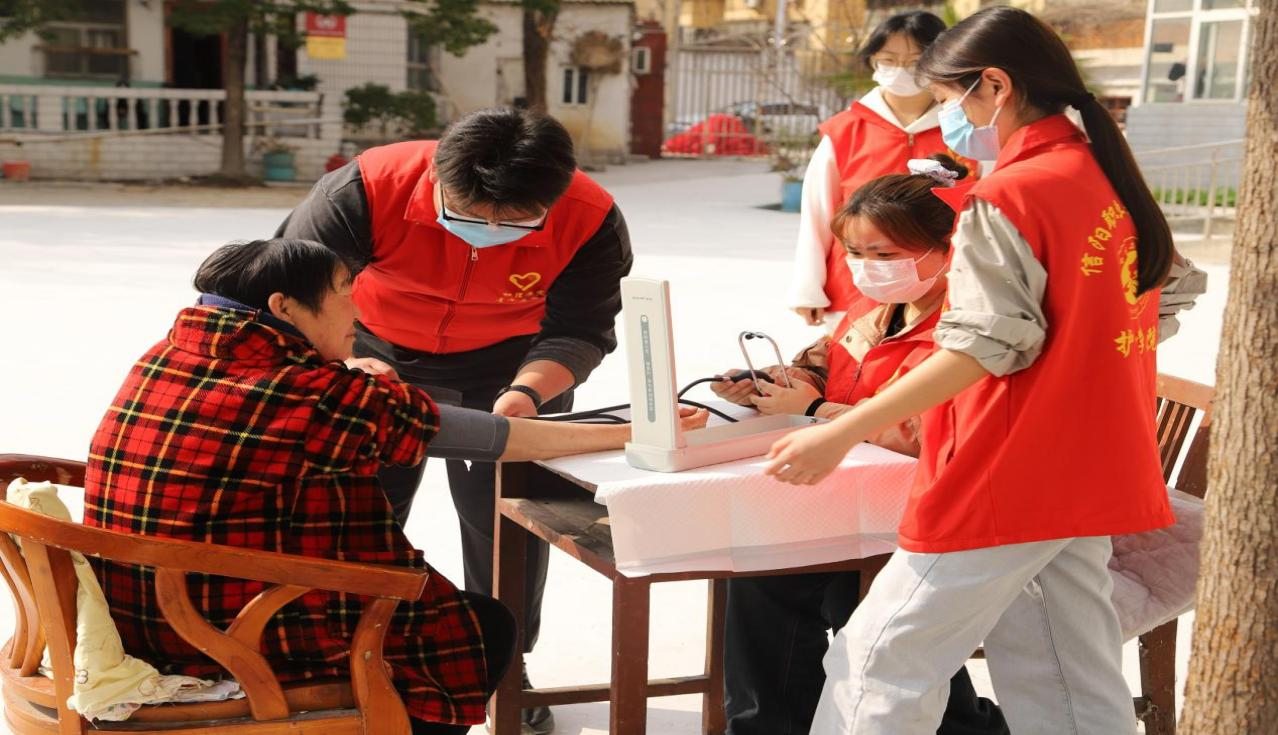 在温暖和煦的春风中,金年会jinnianhuicom党总支带领暖冬社团的“红马甲”们来到信阳市浉河区五星街道河南路社区宝石老年公寓,开展了“爱心护理暖冬行 养老义诊护安康”志愿服务活动,将党的关怀化作温暖春风,在社区养老院奏响了一曲动人的“健康守护交响乐”。