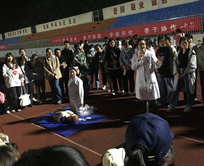 10月22、28日晚和11月2日下午,金年会近20名专业教师在操场对2021级新生开展心肺复苏实操教学,教师们利用模型向学生详细介绍了心脏骤停的判断要点、心肺复苏的实施流程、手法及相关要求。最后学生们进行了心肺复苏练习,老师们给予了认真的指导和纠正。