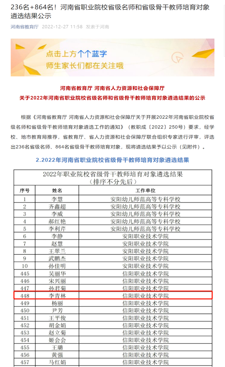 近日,河南省教育厅、河南省人力资源和社会保障厅发布《关于2022年河南省职业院校省级名师和省级骨干教师培育对象遴选结果的公示》,经教师个人申报、学校推荐、专家评审、网站公示,金年会青年骨干教师李青林成功入选2022年河南省职业院校省级骨干教师培育对象。