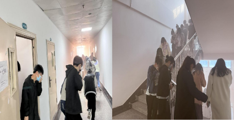 伴随着急促的警报声响和滚滚浓烟,全体师生在消防员的指引下,捂住口鼻、弯着身体快速有序地按照既定的逃生路线撤离到学校的安全区域。