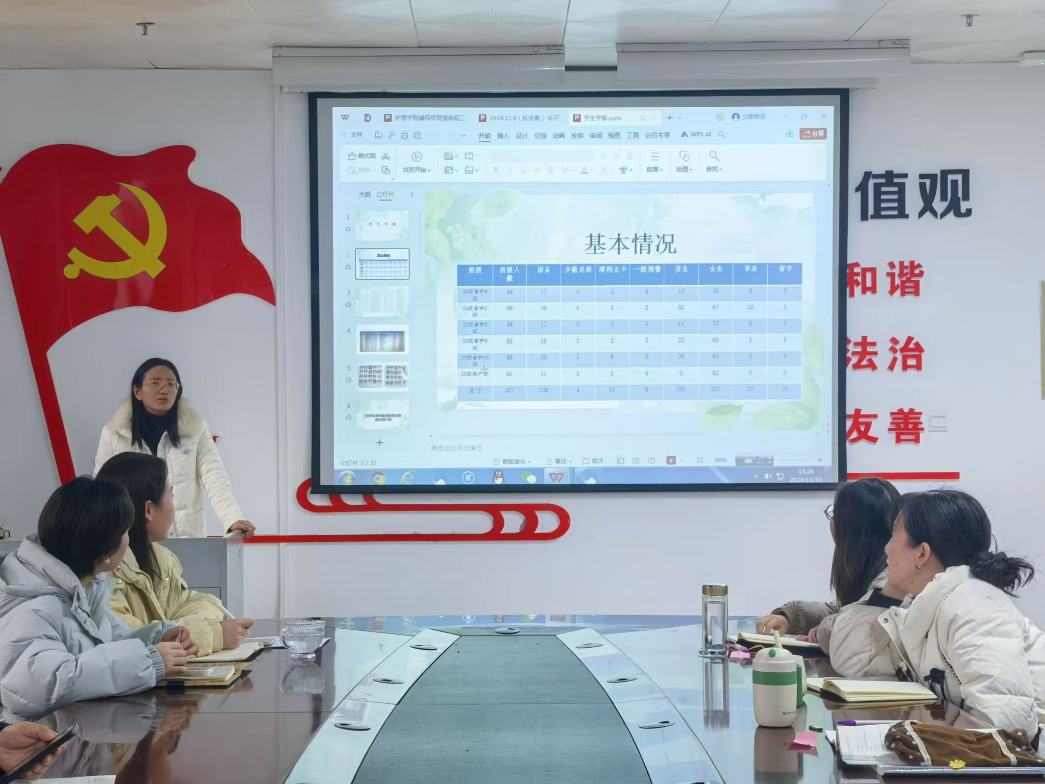 为深入贯彻落实高校思想政治工作会议精神,推动辅导员积极“深入学生、深入生活、深入一线”,掌握班情、熟悉生情、了解家情,压实学生管理服务工作责任,提高学生管理服务水平,12月10日下午,金年会jinnianhuicom在会议室召开辅导员班情熟知汇报会。会议由副书记朱小静主持,副书记李鑫汝、学工办主任、团总支书记、全体辅导员和各班学生代表共同参加。